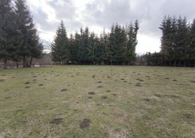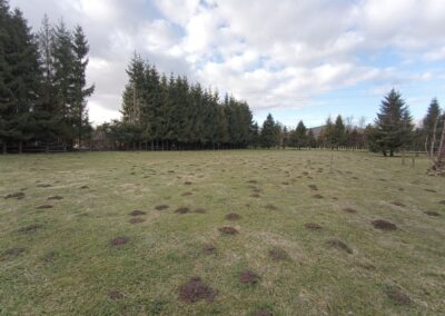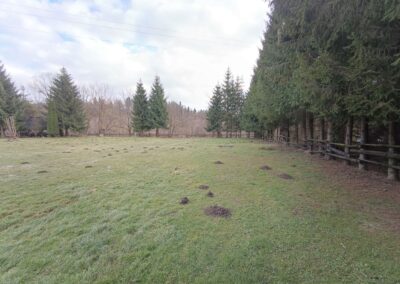 Działka o powierzchni około 3000 m2, korzystnie ukształtowana (teren płaski), wzdłuż granic obsadzona świerkami i ogrodzona drewnianym parkanem. Zlokalizowana jest w sąsiedztwie zabudowy mieszkalnej jednorodzinnej oraz zabudowy rekreacyjnej. Dojazd od gminnej drogi asfaltowej realizowany jest urządzoną drogą gruntową utwardzoną (na zasadzie służebności).
